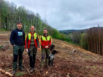 Kahle Waldabschnitte wie dieser sind das Ergebnis des Borkenkäferbefalls als Folge des Klimawandels. Die beiden Revierleiter Sönke Sonnenberg-Metto (Mitte) und Kilian Schäfer (rechts) arbeiten mit ihrem Team (hier: mit Praktikant Jonathan Raber) an nachhaltigen Ansätzen, um den Losheimer Gemeindewald klimafit zu machen.