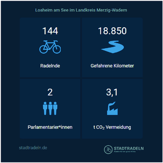 In der Gemeinde Losheim am See sind bisher 163 Teilnehmende in 17 Teams registriert, davon sind 144 Radelnde aktiv dabei. Die Anzahl der Teilnehmenden übersteigt bereits jetzt die des Vorjahres. Einen hohen Anteil daran haben in diesem Jahr die Schulen in unserer Gemeinde, die engagiert in die Pedale treten. Die hohe Resonanz kann daher schon vor Ende der Kampagne als klarer Erfolg gewertet werden und verdeutlicht, welch hohen Stellenwert das Fahrrad bereits in der Alltagsmobilität besitzt.