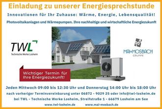 Die Technischen Werke der Gemeinde Losheim am See (TWL GmbH) und die MAI & MOSBACH Gruppe laden Sie ein, Ihre individuellen Möglichkeiten für Photovoltaikanlagen und Wärmepumpen zu entdecken. In einem persönlichen Gespräch analysieren wir Ihre aktuelle Situation und zeigen Ihnen maßgeschneiderte Lösungen für eine effiziente und nachhaltige Energieversorgung.