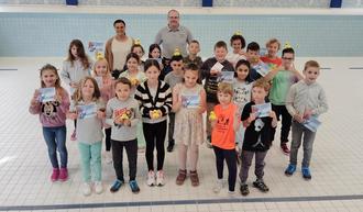 Die Schülerinnen und Schüler der Klassenstufen 2 und 3 mit ihren Seepferdchenurkunden. in der letzten Reihe Monica Becker und Micheal Zeyer