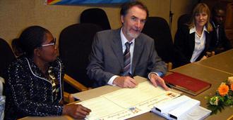 Feierliche Unterzeichnung der Urkunden: Chef de Cité Mme Ekila Yafe, Bürgermeister Lothar Christ, Silvia Kreis, Victor Djema
