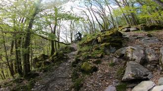 Hier handelt es sich um eine MTB-Tour die über teils naturbelassene und auch angelegte Trails führt. Es wird fahrtechnische Erfahrung vorausgesetzt. Sprünge können nicht immer umfahren werden, zudem gibt es immer wieder steile Abschnitte. Die Tour sollte mit einem vollgefederten MTB gefahren werden. Eine Variosattelstütze ist unerlässlich. Auf der Strecke befinden sich große Wurzeln, Steine und teils nicht überrollbare Absätze. Wer Sprünge mag – ist hier richtig.