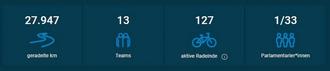 In den drei Wochen vom 01. Juni bis zum 21. Juni haben 127 Radelnde in dreizehn Teams aktiv daran teilgenommen. Insgesamt wurden 27.947 km bei 1.459 Fahrten erradelt, die mit dem Auto 4.583 kg CO2 verursacht hätten.