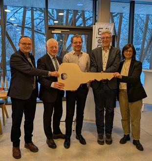 Schlüsselübergabe mit v.l. Bürgermeister Helmut Harth, Wirtschaftsminister Jürgen Barke, Architekt Jens Habermann, Campingplatzbetreiber Stephan Krug und Landrätin Daniela Schlegel-Friedrich