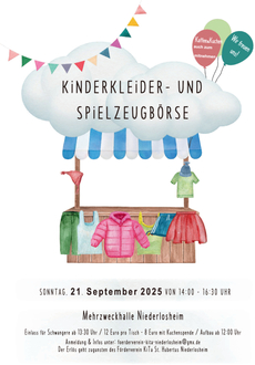 Am Sonntag den 21.09.2025 veranstaltet der Förderverein der KiTa Niederlosheim einen Kinderkleider- und Spielzeugmarkt in der Mehrzweckhalle Niederlosheim. Dort werden von rund 30 Ausstellern gebrauchte Kinderkleider und Spielsachen zum Verkauf angeboten.