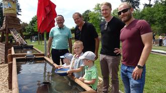 Bei der Eröffnung der Spielanlage „Goldrausch“ testeten Fiete, Lennard und Moritz (von links nach rechts) das neue Aktionsangebot und wurden von Bürgermeister Helmut Harth (links), Pächter Klaus Kemmer (2. von links) sowie Frederic Löwen (3. von links) als Leitung und Daniel Schackmann als Mitarbeiter vom Eigenbetrieb Touristik, Freizeit und Kultur bei der Schatzsuche unterstützt.