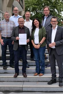 obere Reihe v.l.: Ralf Schumacher, Peter SChweitzer, Jürgen Tamble (Fachbereich Bauen Gemeinde), Björn Kondak (2. Beigeordneter). Vorne v.l.: Bürgermeister Helmut Harth, Landtagsabgeordnete Martina Holzner und Innenminister Reinhold Jost