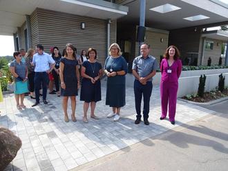 Gemeinsam mit Ministerpräsidentin Anke Rehlinger und Staatssekretärin Yorgova-Ramanauskas überzeugten sich der Losheimer Bürgermeister Helmut Harth sowie Vertreterinnen und Vertreter der Politik mit den beteiligten Bauunternehmen bei der offiziellen Eröffnung der neuen Tourist Info der Gemeinde Losheim am See am Stausee von der Fertigstellung eines touristischen Leuchtturmprojektes im Saarland.