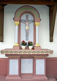 Der Pfarrer Konter-Gedenkaltar mit Altartext, die Gedenkstättte am Eingang der Pfarrkirche St-Martin in Schalkenmehren.