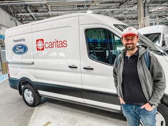 Benedikt Kewerkopf vom Caritasverband Saar-Hochwald bei der Übergabe des E-Transporters im Kölner Ford-Werk