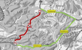 Die Umleitungsstrecke führt aus Richtung Mettlach kommend über die L 158 nach Losheim auf die B 268 und von dort aus über die L 374 Richtung Britten.