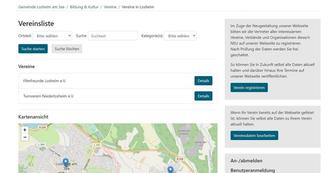 Auf dieser Seite sind alle registrierten Vereine aufgelistet und können über die Suchfunktion auch nach Ortsteilen oder Kategorien gefunden werden.