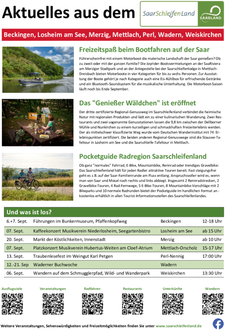 Der Tourismus im Saarschleifenland hat sich zu einem sehr wichtigen Wirtschaftsfaktor entwickelt und trägt in erheblichem Maße zu der hohen Lebensqualität in unserem Grünen Kreis bei. An dieser Stelle wollen wir Sie und Ihre Gäste über aktuelle Themen und Angebote für Freizeit und Urlaub und Veranstaltungen nicht nur in unserer Gemeinde, sondern auch darüber hinaus im gesamten Saarschleifenland informieren.