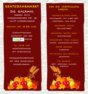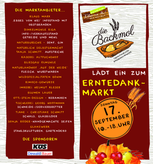 Die Backmol lädt am 17. September zum Erntedankmarkt mit vielen Anbietern von 10.00 Uhr – 18.00 Uhr ein.
