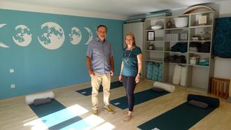 "In einem Yoga- und Kletterurlaub im Jahr 2005 am Gardasee habe ich die Liebe zum Yoga entdeckt. Seither habe ich vom eigenen Yogastudio geträumt. Diesen Wunsch habe ich mir 2014 mit der Eröffnung meines ersten kleinen Studios in Wahlen erfüllt", berichtet Silke Simon beim Besuch von Bürgermeister Helmut Harth. "Für mich gehört zum Yoga einfach auch die gemütliche Atmosphäre, die Tasse Tee oder das erfrischende Wasser vor dem Kurs dazu. Ein Ort zum Ankommen und Wohlfühlen, Ruhe und Raum zum Austausch."