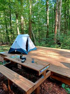 Das Camp in Losheim am See verfügt über eine Holzplattform mit Überdachung für mögliche Übernachtungen auch ohne Zelt (max. 6 Personen) und einen zusätzlichen Bereich für bis zu zwei Zelte. Die anderen Camps in der Region besitzen eine Holzplattform mit Platz für 2 Zelte à 2 Personen oder ein großes Zelt à 4 Personen. Ein kleiner Bachlauf mit klarem Bachwasser und eine Komposttoilette sind in der Nähe.