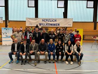 Vordere Reihe v.l. Christoph Rehlinger, Prof. Jörg Loth, Minister Reinhold Jost, der Erste Beigeordnete Stefan Palm, Trainerinnen und 2.v.r. Martina Holzner. Ganz hinten rechts die Handball-Ikone Christian „Blacky“ Schwarzer.