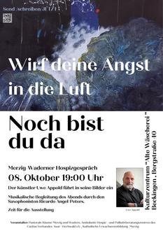Unter dieser Überschrift findet am 8. Oktober um 19:00 Uhr das Merzig-Waderner Hospizgespräch in den Räumlichkeiten des Kulturzentrums „Alte Wäscherei“ in Beckingen (Bergstraße 48) statt. Die Einführung in die Vernissage übernimmt der Künstler Uwe Appold.