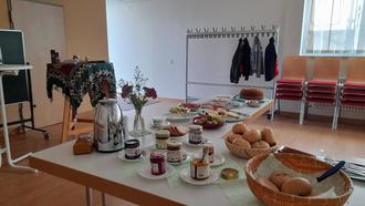 Wie auch im letzten Jahr wurde im Pfarrsaal ein regionales, nachhaltiges und faires Frühstück angeboten. Viele interessierte Menschen ließen sich die ausgewählten Marmeladen, Aufstriche, den Kaffee und Tee schmecken und kamen gemeinsam über die Themen Fairtrade, Nachhaltigkeit ins Gespräch.