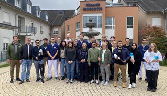 Der 2. Beigeordnete der Gemeinde, Björn Kondak, besuchte den Wohnstift und konnte sich selbst ein Bild vor Ort machen. Als Vertreter des krankheitsbedingt verhinderten Bürgermeisters hieß er alle anwesenden Schülerinnen und Schüler, sowie den Einrichtungsleiter Hans-Werner Brengel, den Pflegedienstleiter Mathias Quintes, die stellvertretende Pflegedienstleiterin Steffi Steffes und die Praxisanleiterinnen Vanessa De Giorgi, Vanessa Schramm und Gabi Welsch herzlich willkommen. „Gerne bin ich der Einladung gefolgt, um dieses spannende Projekt und die engagierten Menschen dahinter kennenzulernen“, betonte Björn Kondak. „Der Fachkräftemangel ist ein großes Problem und macht auch vor einer lebendigen Gemeinde wie Losheim am See nicht Halt. Gute und motivierte Mitarbeitende werden auch bei uns gesucht, sei es im Handwerk, in den Kitas und besonders auch im Tourismus- und Gastronomiebereich. Daher ist die Initiative des Wohnstift Myosotis 24 eine großartige und gelungene Aktion, die gerne von der Gemeinde unterstützt wird.“