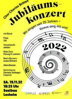Am Samstag, dem 19. November findet im Saalbau in Losheim ein Konzert zum 25-jährigen Jubiläum des Chores Chorios aus Britten unter der Leitung von Frederic Horf statt.