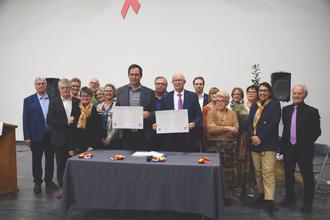 Abends stand im Gemeindesaal (Salle Intercommunale Guy Schott) der Festakt zur erneuten Besiegelung der Partnerstadt an. Der Bürgermeister von La Croix Saint Ouen, Jean Desessart eröffnete die Veranstaltung und zeigte große Freude über den Besuch aus dem Saarland. Ebenfalls anwesend bei dem Festakt waren: Anne-Sophie Fontaine, die Erste Beigeordnete und Stellvertreterin des Bürgermeisters, die Kulturbeauftragte Chantal Herve, Nicolas Compana, stellv. Bürgermeister und Zuständiger für Öffentlichkeitsarbeit und Partnerschaften, Gabi Orbach-Lin und Jean-Claude Robic, Vorsitzende des Partnerschaftsvereins La Croix Saint Ouen und natürlich Hans-Peter Steuer und weitere Vorstandsmitglieder des Partnerschaftsvereins aus Losheim am See.