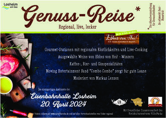 Am 20. April 2024 findet in der Eisenbahnhalle Losheim die 1. Ebbes-von-Hei! Genussreise statt. In charmanter & urbaner Atmosphäre werden eine Vielzahl an raffinierten Minigerichten, die vom Genussteam des Partyservice Schwed kreiert werden, an unterschiedlichen Gourmet-Stationen live zubereitet. Die Gerichte sind mit heimischen Zutaten regionaler Hersteller bespickt, mal anders und modern interpretiert. Wie wäre es beispielsweise als Vorspeise mit einem Bettseichersalat und pochiertem Bio-Ei, anschließend Teigtäschchen vom heimischen Reh mit Salbeibutter oder knuspriger Schweinebauch vom Strohschwein, abschließend eine Creme Brulée von der Tonkabohne? Auch die Vegetarier kommen voll auf Ihre Kosten, beispielsweise mit der Penne aus dem Parmesanrad oder dem veganen Burger aus der Live-Küche. Drei regionale Weingüter werden handverlesene Weine anbieten, darunter Peter Greif, Gorges-Müller und Graf Kesselstadt. Zusätzlich kann der Gast verschiedene Kaffeespezialitäten an der Coffee- oder Gin-Tonic-Bar genießen. Der Abend wird begleitet von grandioser Live-Musik der Moving-Entertainment Band Combo Combo und dem zauberhaften Moderator Markus Lenzen, die gute Laune versprechen! Eine Veranstaltung präsentiert von der Naturbursche Genussmanufaktur in partnerschaftlicher Zusammenarbeit mit der Regionalinitiative „Ebbes-von-Hei!“, der Gemeinde Losheim sowie des Kreiskulturzentrums Villa Fuchs.