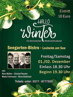 Mit ihren Stimmen (Sopran, Bariton und Tenor) sorgen sie so für abwechslungsreiche Unterhaltung. In der gemütlichen und heimeligen Atmosphäre des Seegarten Bistros am Stausee in Losheim erklingen wie schon in den vergangenen Jahren bekannte und neue Weihnachtslieder und Songs. Außerdem werden an diesem Abend wieder Geschichten und besinnliche Texte, vorgetragen von Nina Müller für vorweihnachtliche Stimmung sorgen. Genießen Sie einen besinnlichen Abend bei einem erlesenen Glas Wein und leckeren Köstlichkeiten (kleine Speisekarte vom Seebistro) und starten Sie so genussvoll in den Winter.