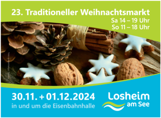 Traditionell am ersten Adventwochenende, dem 30. November und 1. Dezember 2024, samstags von 14:00 bis 19:00 Uhr und sonntags von 11:00 bis 18:00 Uhr findet in und vor der Eisenbahnhalle Losheim am See der große Weihnachtsmarkt statt.