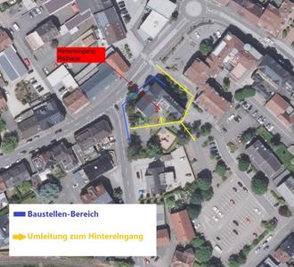 Für die durch die Bauarbeiten entstehenden Behinderungen und Beeinträchtigungen bitten wir alle betroffenen Anwohner, Verkehrsteilnehmer sowie die Besucherinnen und Besucher des Rathauses um Verständnis.