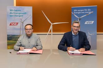 Bürgermeister Helmut Harth (links im Bild) mit Dr. Stephan Tenge, Vorstand der VSE AG, bei der Vertragsunterzeichnung in Saarbrücken.