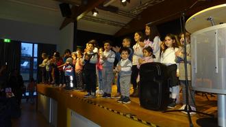 Ca. 30 Kinder aus 9 Nationen sangen gemeinsam auf der Bühne zwei Weihnachtslieder und wurden spontan von der Band „MGM“ begleitet, die auch den gesamten Nachmittag musikalisch umrahmte. Peter Fisch hatte mit den Kindern die Lieder eingeübt. Beim Klassiker „In der Weihnachtsbäckerei“ hatten alle viel Spaß. Ganz mutig stellte sich später noch Tiba aus dem Irak auf die Bühne, die 10 Strophen des Gedichts „Die Weihnachtsmaus“ auswendig gelernt hatte und dem Publikum darbot.