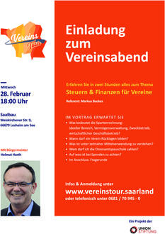 Am Mittwoch, den 28. Februar 2024, macht die Vereinstour der Union Stiftung Station in Losheim am See. Ab 18.00 Uhr wird das Thema „Steuern und Finanzen für Vereine“ im Losheimer Saalbau behandelt.