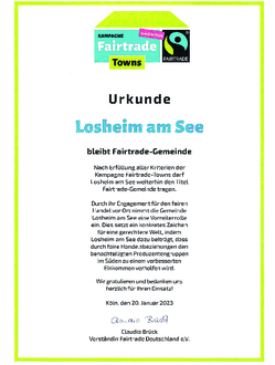 Losheim am See ist eine von über 800 Fairtrade-Towns in Deutschland. Das globale Netzwerk der Fairtrade-Towns umfasst über 2.000 Fairtrade-Towns in insgesamt 36 Ländern, darunter Großbritannien, Schweden, Brasilien und der Libanon. Weiter Informationen zur Fairtrade-Towns Kampagne finden Sie unter www.fairtrade-towns.de