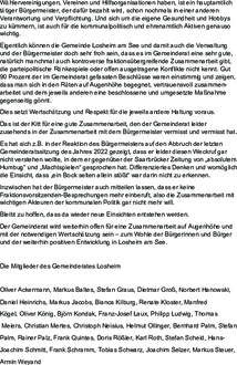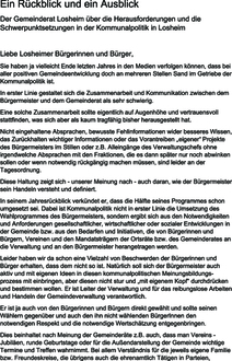 Der Gemeinderat wird weiterhin offen für eine Zusammenarbeit auf Augenhöhe und mit der notwendigen Wertschätzung sein - zum Wohle der Bürgerinnen und Bürger und der weiterhin positiven Entwicklung in Losheim am See.