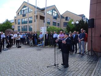 Altbürgermeister Raimund Jakobs hielt anlässlich der Einweihung des nach ihm benannten „Raimund-Jakobs-Platzes“ am 12. Juli 2020 neben dem Losheimer Rathaus eine Dankesrede vor den versammelten Gästen aus Politik und Bevölkerung.