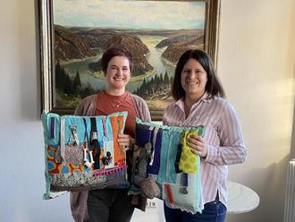 Frau Schneider (Caritas) und die Seniorenbeauftragte der Gemeinde, Lisa-Maria Pfeffler bei der Übergabe der Kissen im Schlösschen Losheim