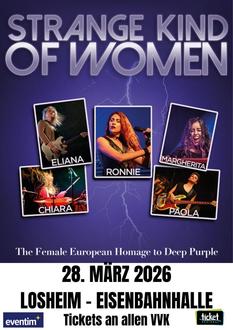 Für viele Anhänger ist das Deep Purple Doppel-Live-Album „Made In Japan“ noch immer das Highlight unter den vielen Veröffentlichungen der Band und wird als Meilenstein in der Geschichte des Hard Rocks und des Heavy Metal angesehen. Inzwischen ist der berühmte Konzertmitschnitt ein halbes Jahrhundert alt. Die von der italienischen Gitarristin Eliana Cargnelutti gegründete Band „Strange Kind Of Women bringt die Songs dieses legendären Albums originalgetreu und mit einer atemberaubenden Show auf die Bühne.
