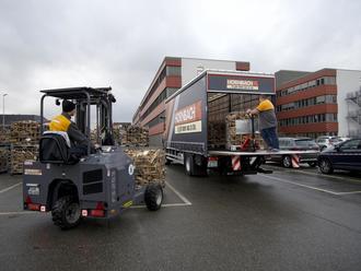 150 Gitterboxen mit je einem Raummeter luftgetrocknetem Brennholz/Buchenholz werden ins Ahrtal gefahren. Bild: Hornbach