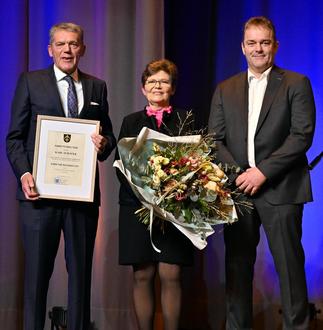 Nach der Laudatio durch Landrat Dietmar Seefeldt überreichte Markus Sell die Urkunde zur Ehrenbürgerschaft an Karl Schäfer und einen Blumenstrauß an seine Frau Marianne. Alle Redner waren sich einig, dass man ein solches Amt über eine so lange Zeit nur ausüben kann, wenn die Familie und vor allem die Ehefrau dahinterstehen und unterstützen.