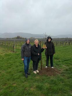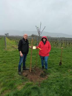 Das Wetter war regnerisch und stürmisch, aber Familie Matt-Schwaab und Ehepaar Nicole und Daniel Schwaab pflanzten tapfer jeder Ihren Mandelbäum in der Hochzeits- und Jubiläumsallee Kirrweiler.