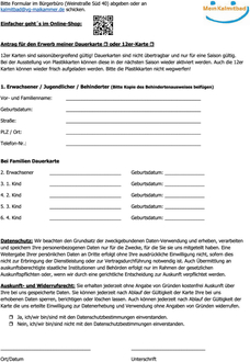 Wenn Sie den Online-Service nicht nutzen möchten, füllen Sie bitte das beiliegende Formular aus und überweisen den entsprechenden Betrag bis zum 06.05.2026 auf unser Bankkonto (IBAN: DE22 5486 2500 0005 3650 90). Bitte als Verwendungszweck Name und Vorname der Karteninhaber angeben, so dass wir Ihre Zahlung zuordnen können. Nachträgliche Überweisungen können nicht mehr berücksichtigt werden. Entweder sind die Karte dann im Online-Shop oder direkt an der Freibadkasse (mit Wartezeiten) zu erwerben.