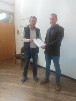 Forstamtsrat Rainer Northoff durfte Anfang Mai sein 40-jähriges Dienstjubiläum feiern. Der Vorsitzende des Forstzweckverbandes 5. Haingeraide, Ortsbürgermeister Karl Schäfer überreichte Herrn Northoff Jubiläumsurkunde der Ministerpräsidentin Malu Dreyher.