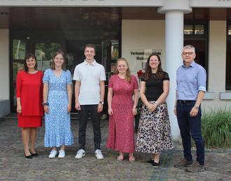 Unser Bild zeigt von links nach rechts Bürgermeisterin Gabriele Flach, Lisa Bantele, Julian Schultz, Carolin Herty, Personalratsvorsitzende Sophia Fritz und Büroleiter Andreas Reuter bei der Gratulation.