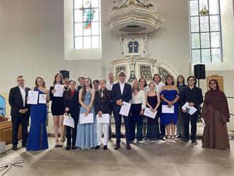 Die Abschluss-Schülerinnen und Schüler wurden am 5. Juli in der evangelischen Kirche Edenkoben feierlich und würdig verabschiedet. Nicht nur von Schulleiter Michael Eich, der den Abend mit dem Fußballzitat „Da ist das Ding" zusammenfasste, sondern auch von Landrat Dietmar Seefeldt, dem 1. Beigeordneten der VG Edenkoben Eberhard Frankmann, der 1. Stadtbeigeordneten Helga Vogelgesang, der Vorsitzenden des Schulelternbeirates Michaela Müller sowie den Schülersprecherinnen Leonie und Lucia. Musikalisch wurde der Nachmittag begleitet von der Windband und von Lenia Staiber (Gesang), auf dem Klavier begleitet von Eva Vester.
