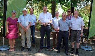 Landrat Dietmar Seefeldt (Mitte) und Susanne Schwarz, Sportabzeichen-Kreisbeauftragte für den Sportkreis Südliche Weinstraße (links), mit den langjährigen Prüfern (rechts) und Ottmar Klein vom TV Bad Bergzabern (2.v.l.).