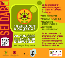 Kirrweiler wird Zukunftsdorf! Und alle können mitmachen. Sei dabei, wenn wir am Samstag, 20.08. auf eine interaktive „Zeitreise“ in die Zukunft gehen. Akteur:innen und Engagierte aus den „Zukunfts-Projekten“ zeigen uns an verschiedenen Stationen im Dorf z. B. wie wir auf den demografischen Wandel reagieren können, wie postfossile Mobilitätskonzepte für die Zukunft aussehen oder wie wir Sonnen- und andere erneuerbaren Energiequellen nutzen können. Auch unsere Ernährung und die Erzeugung von Lebensmitteln wird Thema sein - wir wollen unabhängiger und gesünder werden, und gleichzeitig etwas zum Klimaschutz beitragen.