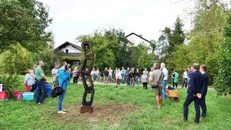 Am Freiheitsbrunnen waren 36 Plakate aus der partizipativen Aktion von Anja Roth zu sehen, die drei Wochen vorher stattfand. Nur wenige Meter weiter, angeführt von Sax2Walk, spazierte das Publikum durch den parallel stattfindenden Kunstmarkt und kurz hinter dem Edelhof, ging es entlang des Kropsbachs, vorbei an der Open Air Ausstellung „WOANDERS - Sonne aus Ost“. Dort spielen großformatige, semitransparente Motive mit Landschaft und Licht. Eine wunderbare Einstimmung für das Kunstwerk von Lilau, denn auch bei seiner Skulptur mit dem Titel „Leichtigkeit“ spielen Landschaft und Licht eine wichtige Rolle. Wenige Tage vorher, genau positioniert, verändert der Lichteinfall die Ausstrahlung des Kunstwerks. Wie magisch dahin geworfen, stehen die offenen Kuben in einer Balance und geben dem schweren Eichenholz eine „Leichtigkeit“. Dies gilt auch für unser Leben, sagte der Künstler Lilau. Nicht alles läuft einfach, geradlinig und bei aller Schwere sollten wir immer eine Balance und eine „Leichtigkeit“ finden.