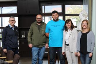 v.l.n.r.: Büroleiter Andreas Reuter, Personalratsvertreter Thomas Schutzius, Dimitri Tischenko, Bürgermeisterin Gabriele Flach und Miriam Schönig