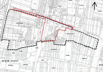 Der Geltungsbereich des Bebauungsplans ist auf dem abgedruckten Auszug des Lageplans mit einer gestrichelten Linie umrandet. Die schwarze Umrandung zeigt den ursprünglich beschlossenen Geltungsbereich des Bebauungsplans, die rote Umrandung stellt den geänderten Geltungsbereich dar, der am 23.06.2021 beschlossen und am 16.07.2021 veröffentlicht wurde.